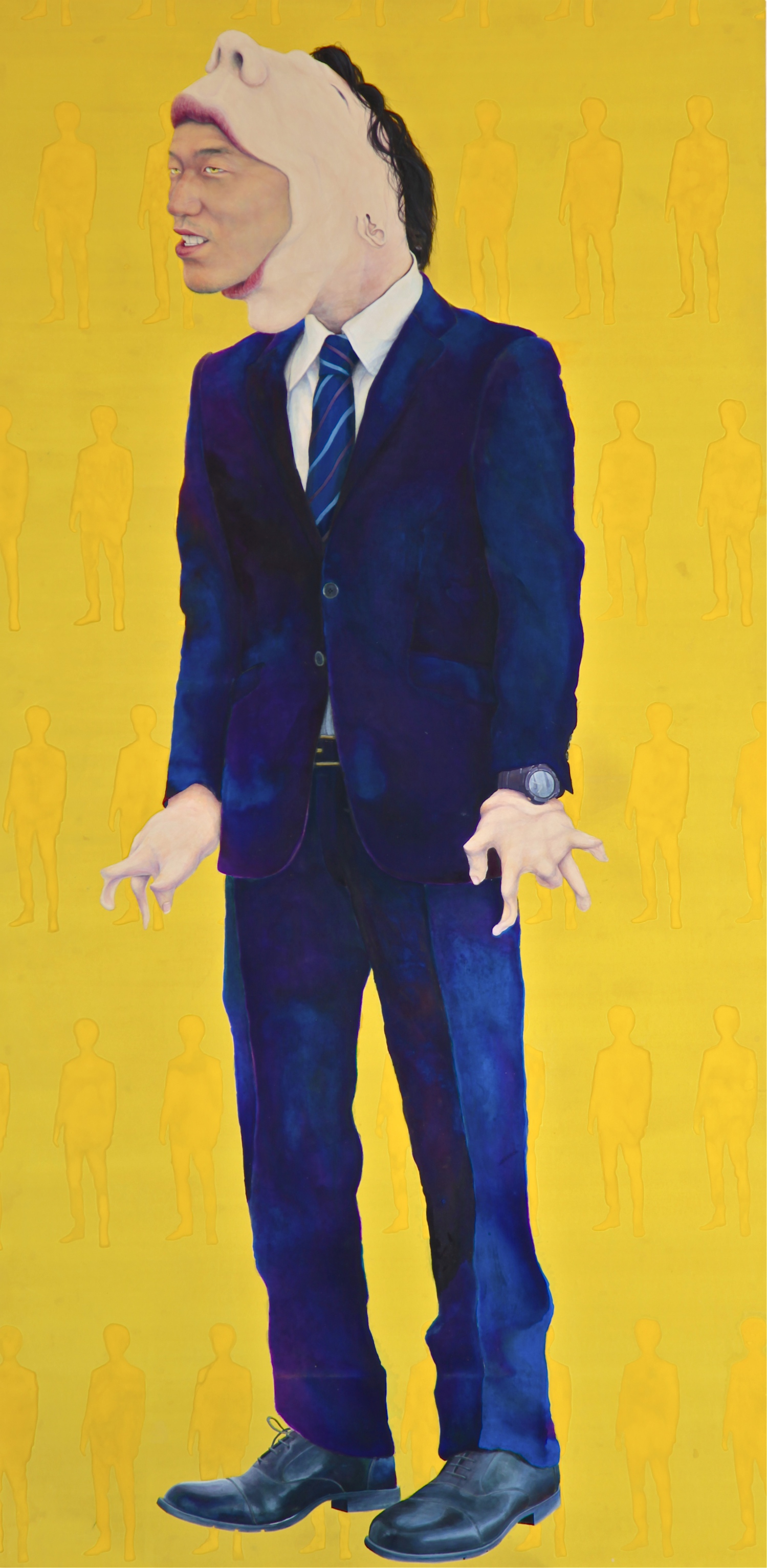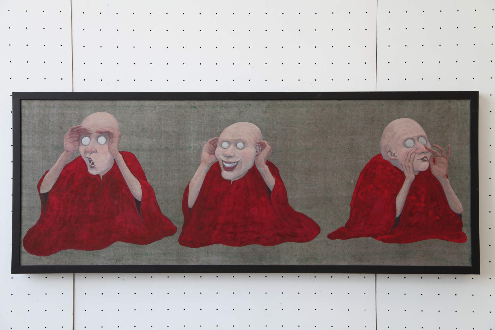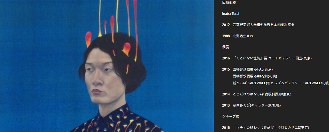 整体的展出作品都挺不错的,推荐大家可以来看看以后(去官网看了一下,貌似每年都会有,还有限定期间的INS和推特);在三楼,也就是展区最后的一片区域,我看到了一幅非常吸引我的画,画风挺恐怖却意义深刻让我在画面前驻足观赏了许久。有点让我想到了今敏的《红辣椒》。后来回去查了一下这幅画的作者是因幡都頼,也是毕业于武藏野的学生,碰巧也是北海道人。