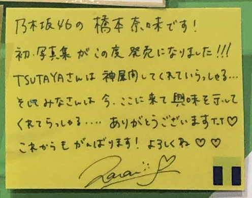 之后去了涩谷TSUTAYA,看到了以前乃团成员们的留言,有一张娜娜敏的,看文字是当时写真集发售时候写的,真是令人怀念。