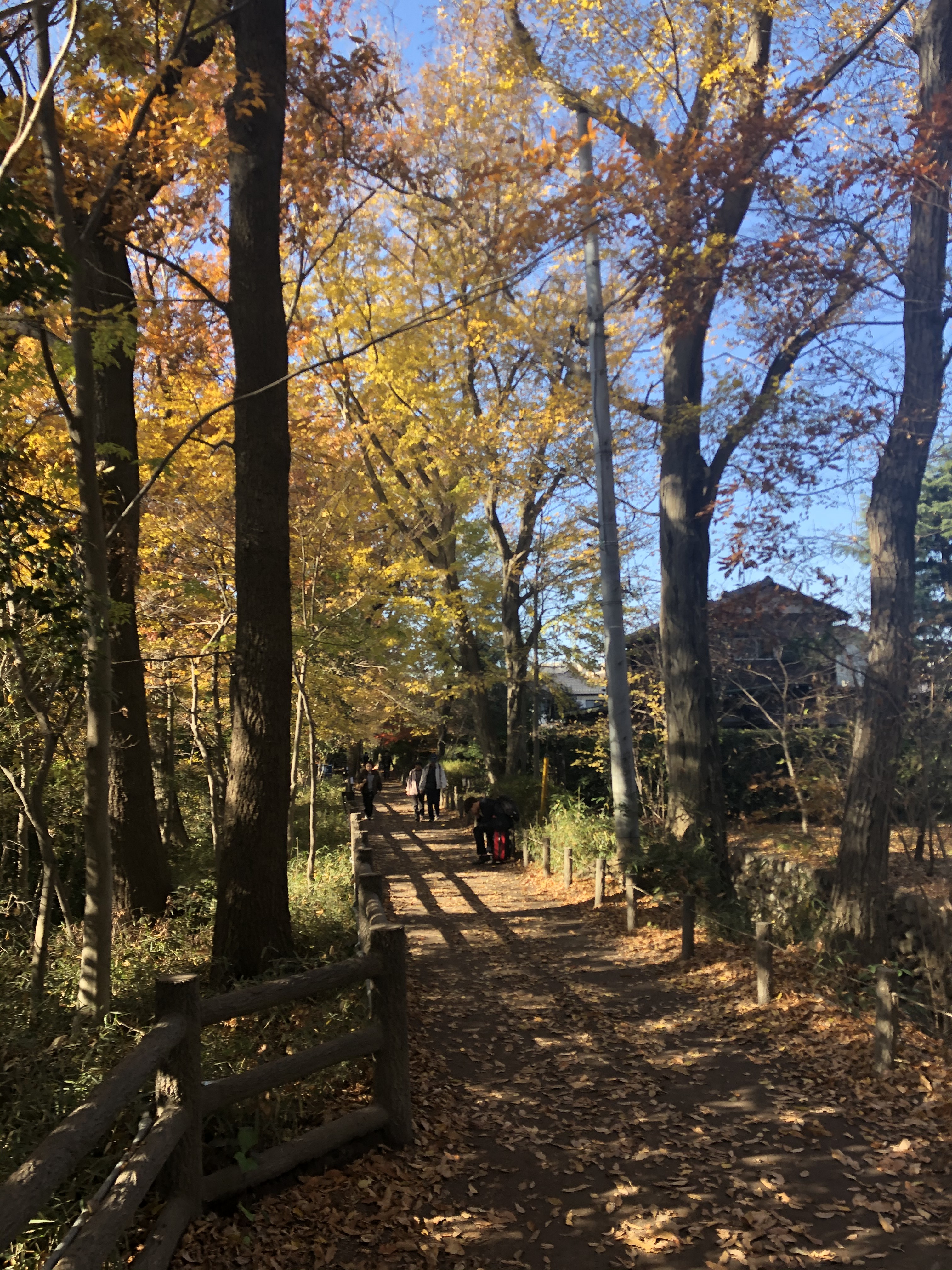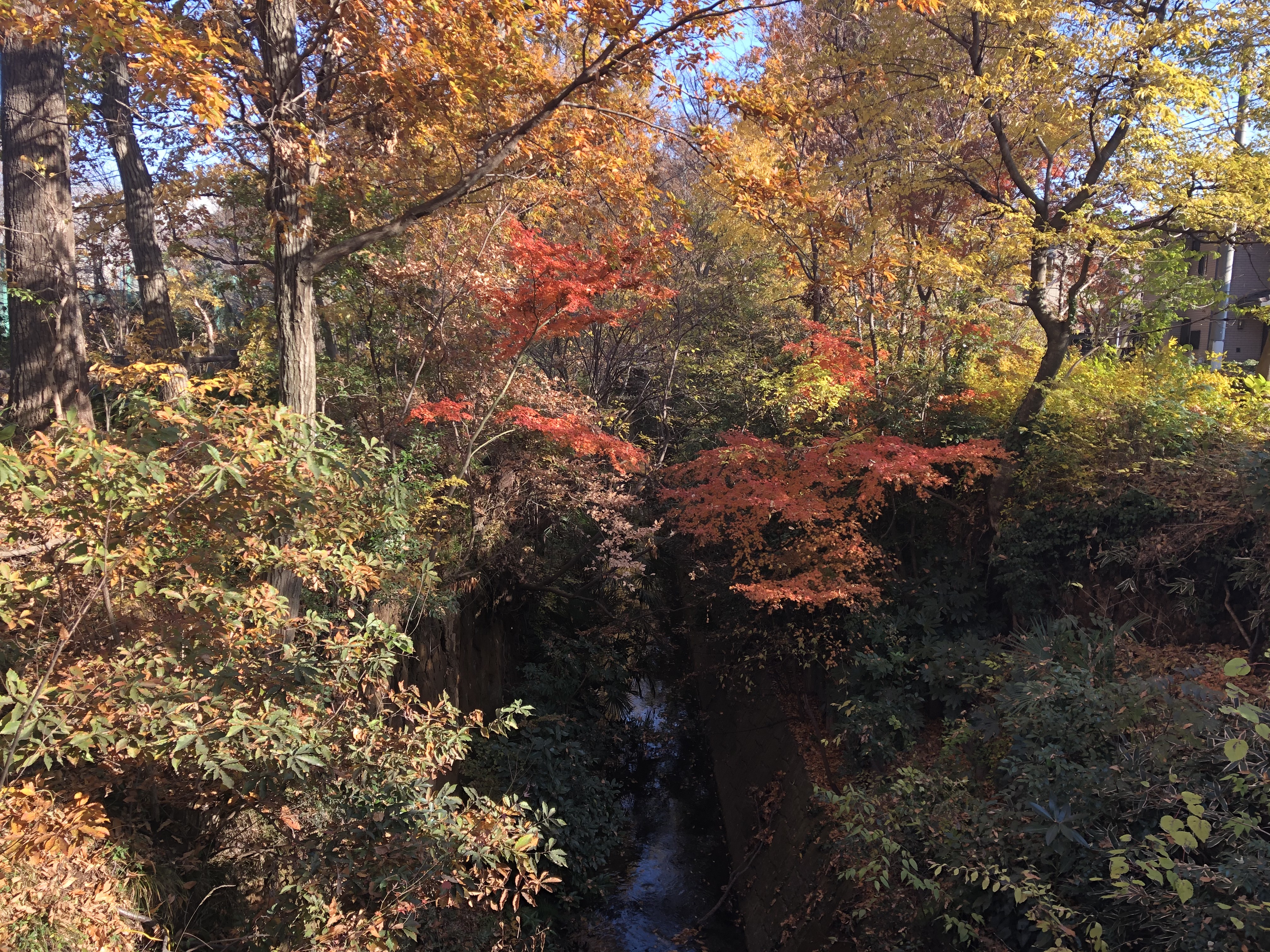 下了车,已全然不见东京高耸的建筑与川流交错的车道,只有非常日式平淡的市井小道。车站下来没几步路看到了一家松屋,心想等巡礼完正好来这儿吃个午饭。路上有蛮多学生的,一下就让我感到了一种怀念的校园味道。街道很小,循着地图走着,走至需要过马路的时候,碰巧对面是一家全家便利店,还挺大。经过全家后右转,是一条非常美丽的林溪小路。选择了靠右侧的小路走了下去,路上有充满活力的中学生们,有漫步的老人,这天风挺大的,秋叶被哗哗地吹落下来,真的是非常美丽。原本还以为这条路很短,走下去才发现意外的长。 走了大概有7分钟的样子,确实是非常想让人驻足的空间。