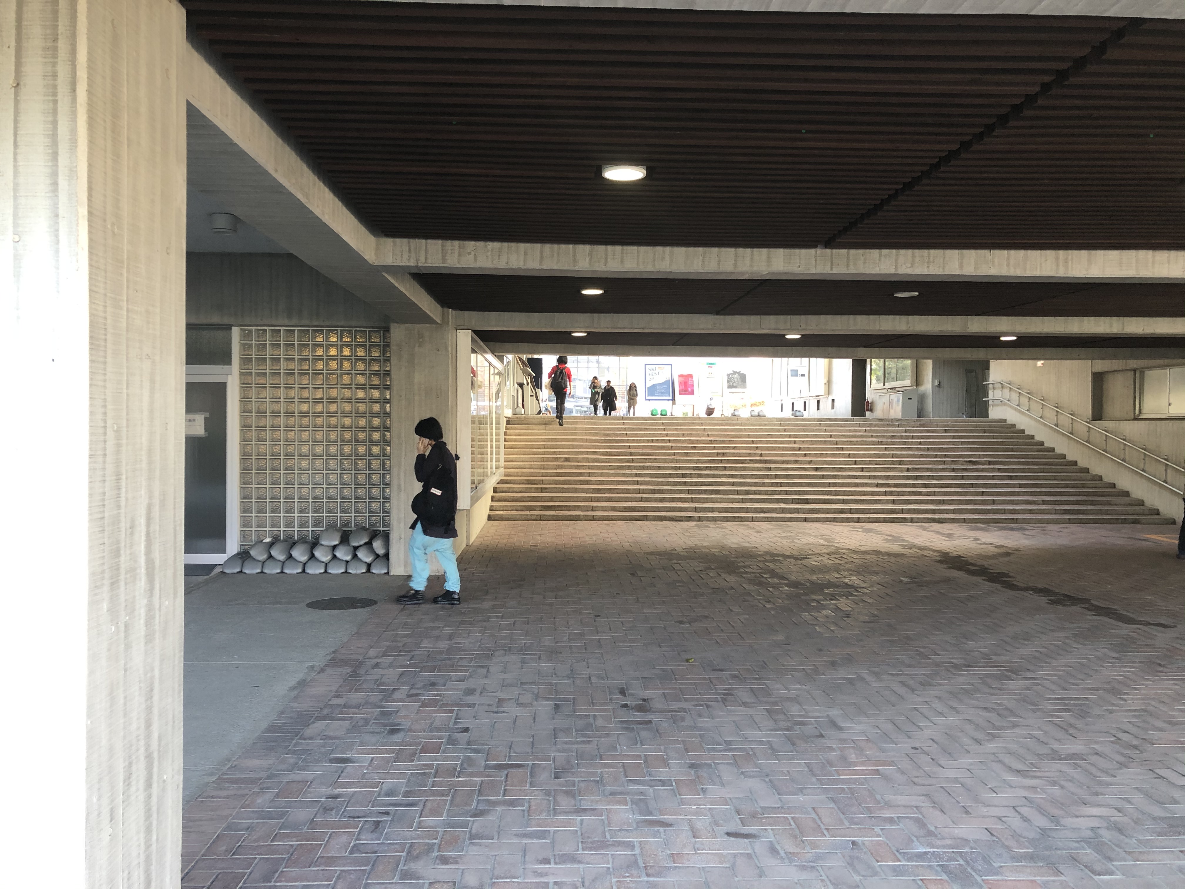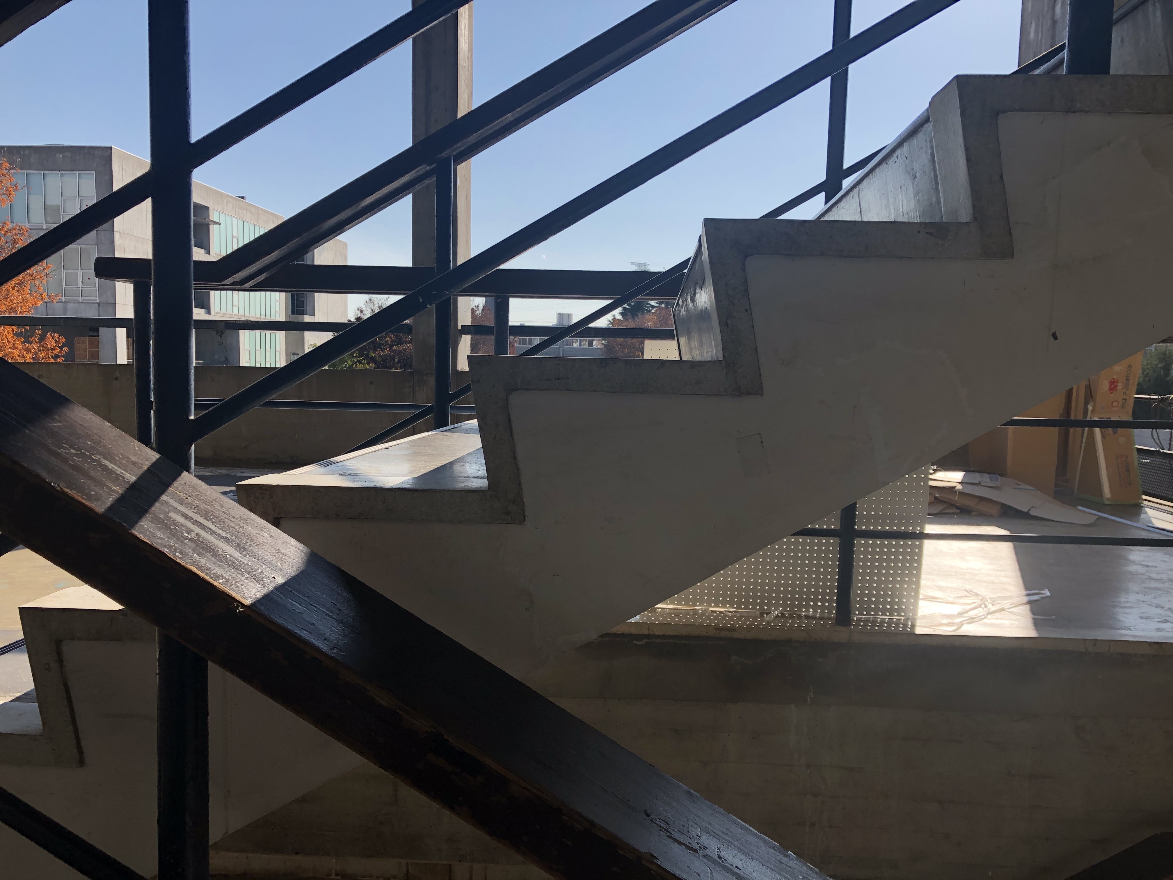 穿过中庭,一开始是漫无目的地到处走动,穿过了地下过道,下面有正在布置展览的学生们,展示的东西都比较偏艺术,看不大懂也就没有拍照了。走来走去,路过了一些材料制作室,设施都挺完备的。武藏野的建筑外部材料基本上是非常日式的清水混凝土,没有过多冗余的装饰,给人精简干练的感觉。由于建校已经有些年头了,大多数的建筑外立面略显陈旧,并没有特别大的让人惊艳的地方。