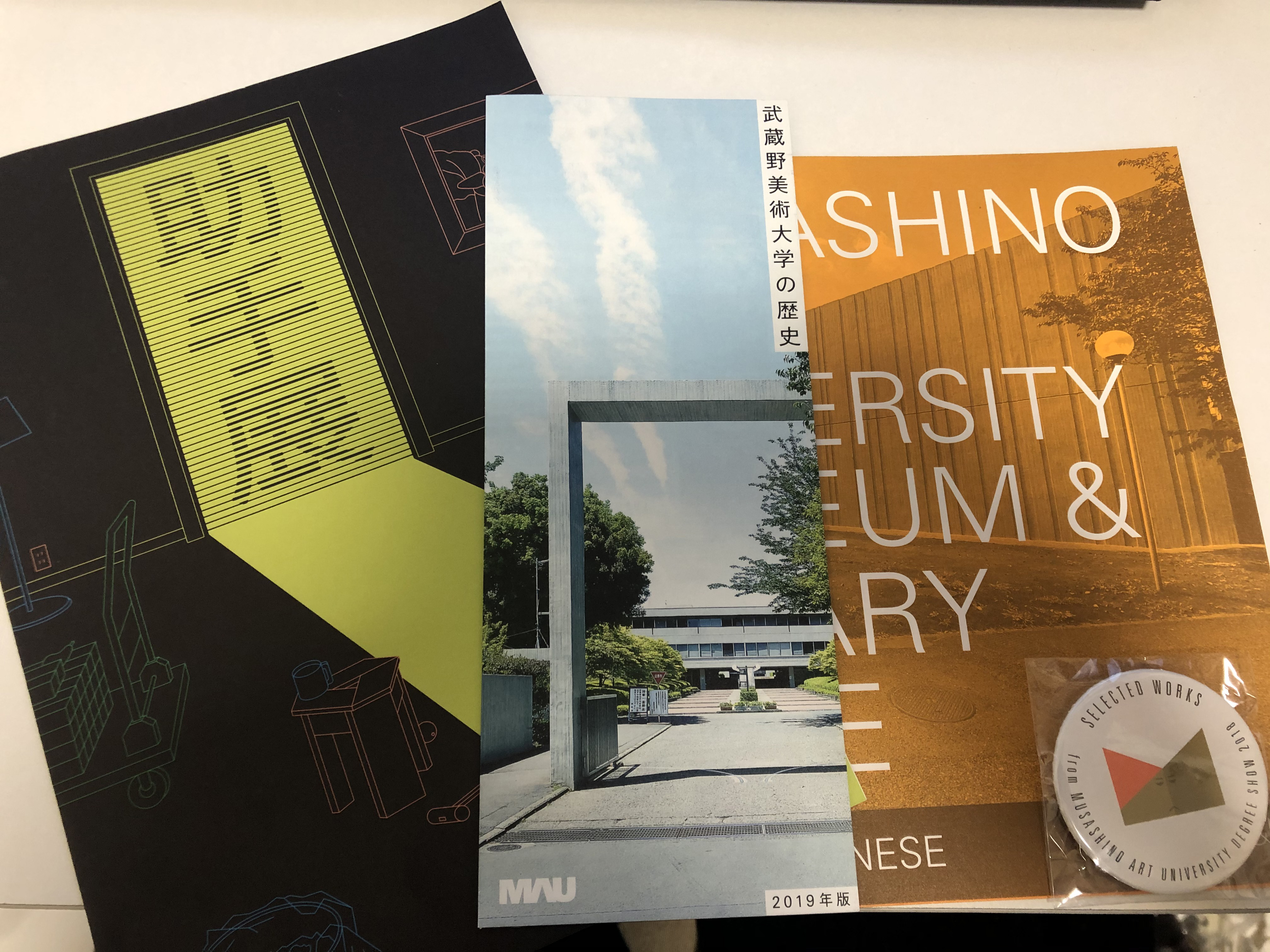差不多了,下了楼梯,准备离开美术馆,看到一旁的案内台陈列了一些这次展的宣传物料(小册子/海报啥的),还有一些关于武藏野美大的宣传册和徽章,都是物料可以拿取的,就各拿了一份,挺好看的,也算是为这次巡礼留个小纪念品,挺好。